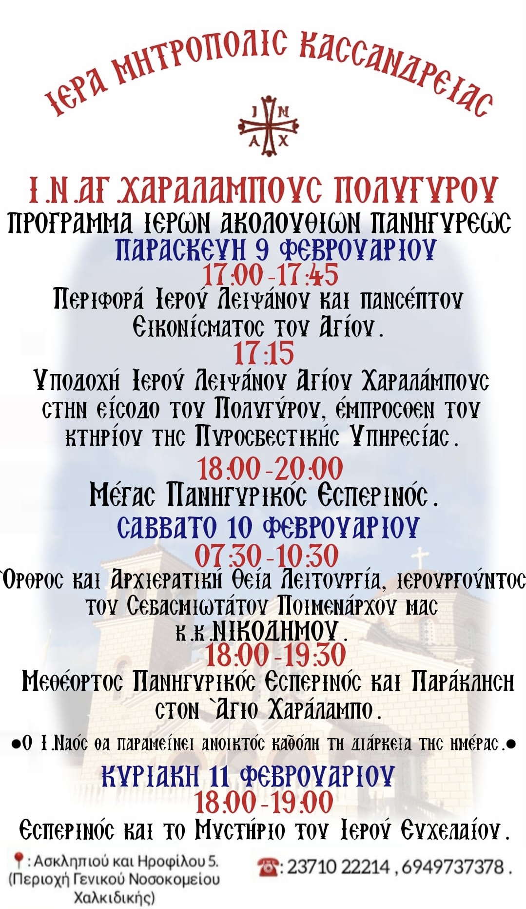 Δείτε το πρόγραμμα της Ιεράς Πανήγυρις του Ιερού Ναού Αγίου Χαραλάμπους στον Πολύγυρο: