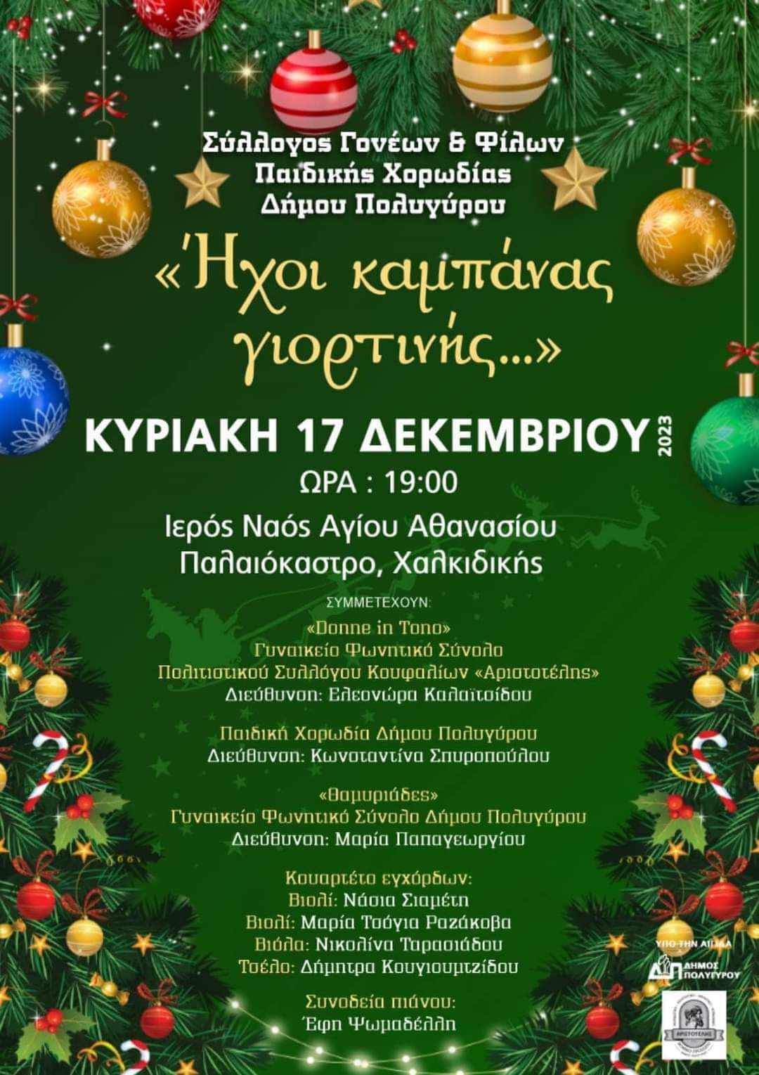 Ο Σύλλογος Γονέων και Φίλων της παιδικής Χορωδίας Δήμου Πολυγύρου, διοργανώνει την Κυριακή 17 Δεκεμβρίου με θέμα “Ήχοι καμπάνας Γιορτινής”. Η εκδήλωση θα λάβει χώρα στον Ιερό Ναό Αγίου Αθανασίου του Παλαιοκάστρου και θα ξεκινήσεις στις 7.00 το απόγευμα.