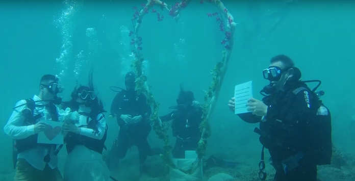 Ο Πέτρος και η Μυρτώ αντάλλαξαν όρκους αιώνιας αγάπης και πίστης στο μαγευτικό βυθό της Αλοννήσου. Το ζευγάρι πάντρεψε ο δήμαρχος Αλοννήσου Πέτρος Βαφίνης που είχε λάβει δίπλωμα κατάδυσης προκειμένου να τελεί γάμους κάτω από τα γαλαζοπράσινα νερά του νησιού. Παρόντες στον βυθό ήταν οι δύο κουμπάρες, η Πρόεδρος της Επιτροπής Τουρισμού Μαρία Αγάλλου που ανέλαβε τη γαμήλια διοργάνωση, καθώς και τρεις εκπαιδευτές καταδύσεων που εθελοντικά παρείχε το καταδυτικό κέντρο Triton Dive Centre.