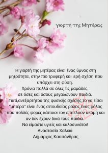 «Η γιορτή της μητέρας είναι ένας ύμνος στη μητρότητα, στην πιο τρυφερή και ιερή σχέση που υπάρχει στη φύση», σημείωσε ανήμερα της ημέρας της Γιορτής της Μητέρας που εορτάζεται σήμερα 14 Μαΐου η Δήμαρχος Κασσάνδρας Αναστασία Χαλκιά.