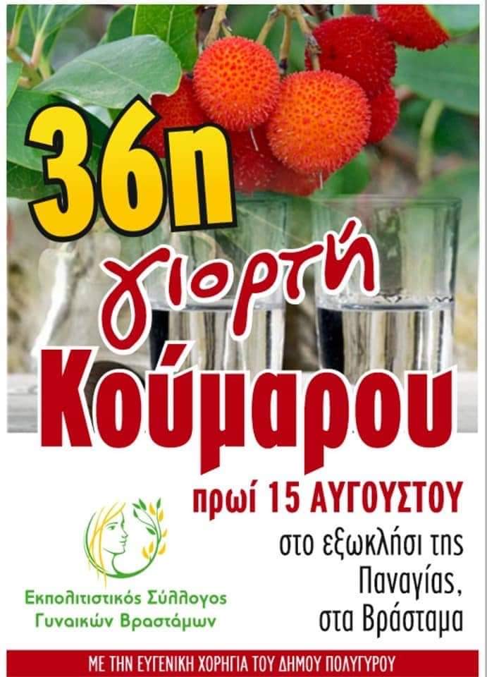 Στις 15 Αυγούστου θα επιστρέψει η γιορτή του κούμαρου στο ξωκλήσι της Παναγίας στα Βράσταμα. Το τοπικό προϊόν του χωριού θα το προσφέρει ο σύλλογος γυναικών δωρεάν σε όλους τους επισκέπτες του πανηγυριού!
