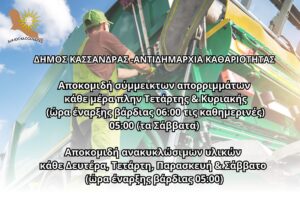 «Παρακαλούμε πολύ για να διατηρήσουμε την Κασσάνδρα μας καθαρή να ακολουθούμε τις ώρες και τις ημέρες του προγράμματος» σημειώνει σε ανακοίνωησή του ο Αντιδήμαρχος καθαριότητας Παύλος Παντζίκης.