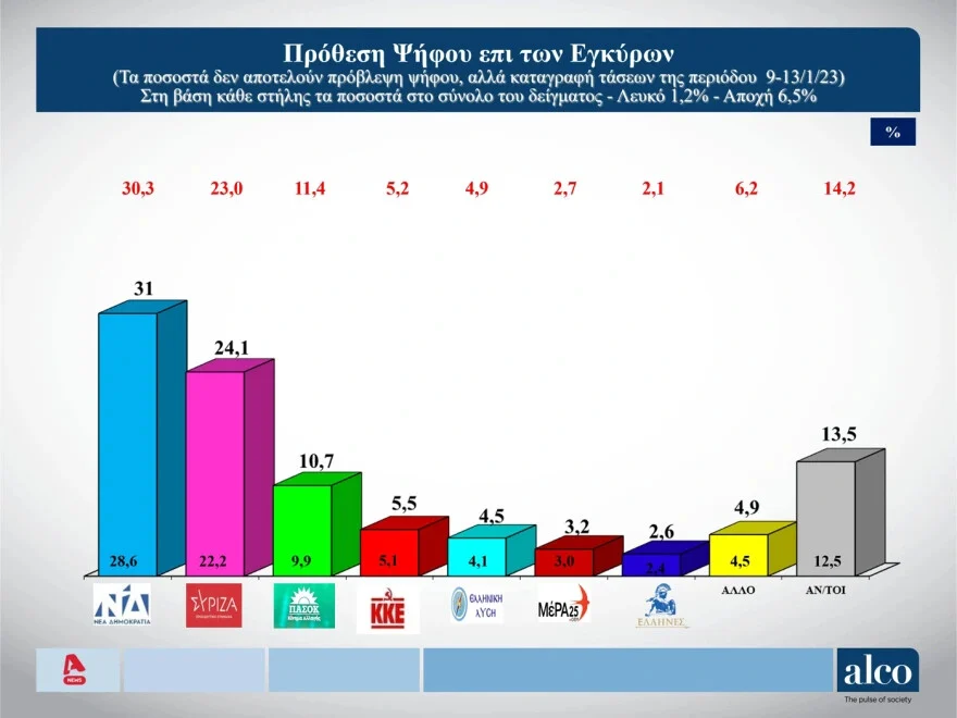 Η Νέα Δημοκρατία συγκεντρώνει το 31% στην πρόθεση ψήφου, έναντι 24,1% του ΣΥΡΙΖΑ, στη δημοσκόπηση της Alco για τον Alpha, το δεύτερο μέρος της οποίας παρουσιάστηκε σήμερα στο κεντρικό δελτίο ειδήσεων του σταθμού.