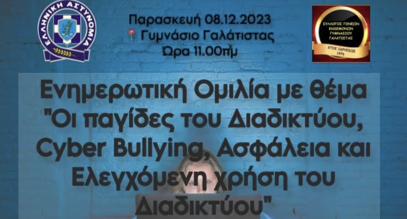Η ομιλία που αφορά τους μαθητές του Γυμνασίου-Λυκείου έχει ως θέμα «Οι παγίδες του Διαδικτύου, Cyber Bullying, ασφάλεια και ελεγχόμενη χρήση του Διαδικτύου».