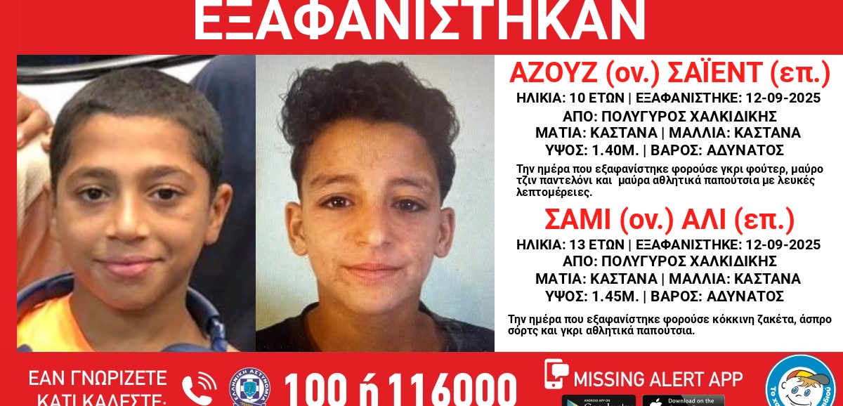 Συναγερμός έχει σημάνει για την εξαφάνιση δύο ανήλικων παιδιών στον Πολύγυρο Χαλκιδικής. Πρόκειται για τον Αλί Σαμί, 13 ετών, και τον Σαϊέντ Αζούζ, 10 ετών, αιγυπτιακής καταγωγής, οι οποίοι χάθηκαν το μεσημέρι της Παρασκευής 12 Σεπτεμβρίου 2025.