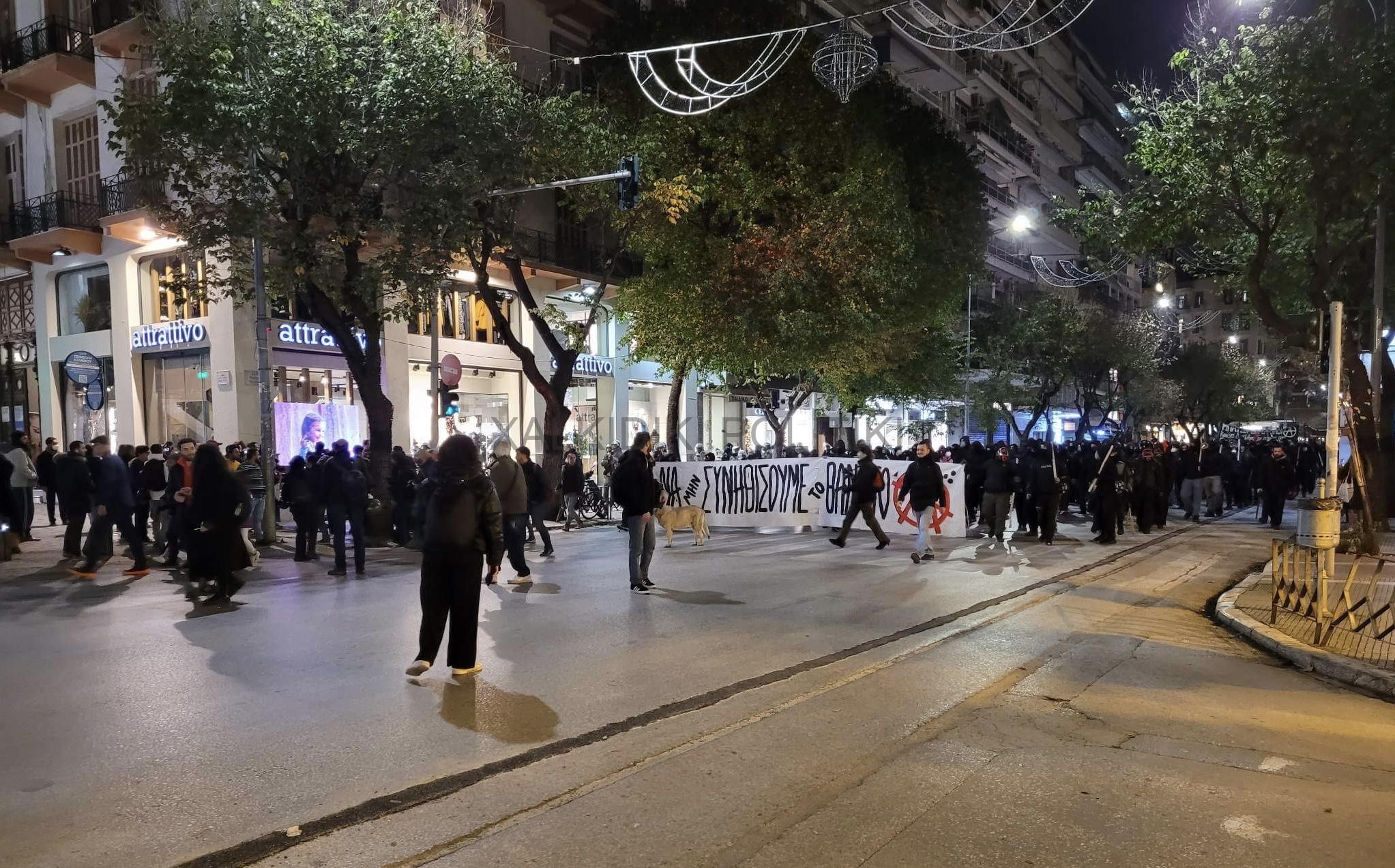 Πορεία πραγματοποιείται αυτή την ώρα στο κέντρο της πόλης της Θεσσαλονίκης για τα 14χρόνια από την δολοφονία του Αλέξανδρου Γρηγορόπουλου που έπεσε νεκρός από ειδικό φρουρό, με το κλίμα να είναι τεταμένο μετά τον πυροβολισμό στο κεφάλι του 16χρονου στη Θεσσαλονίκη χθες, επίσης από όπλο αστυνομικό.