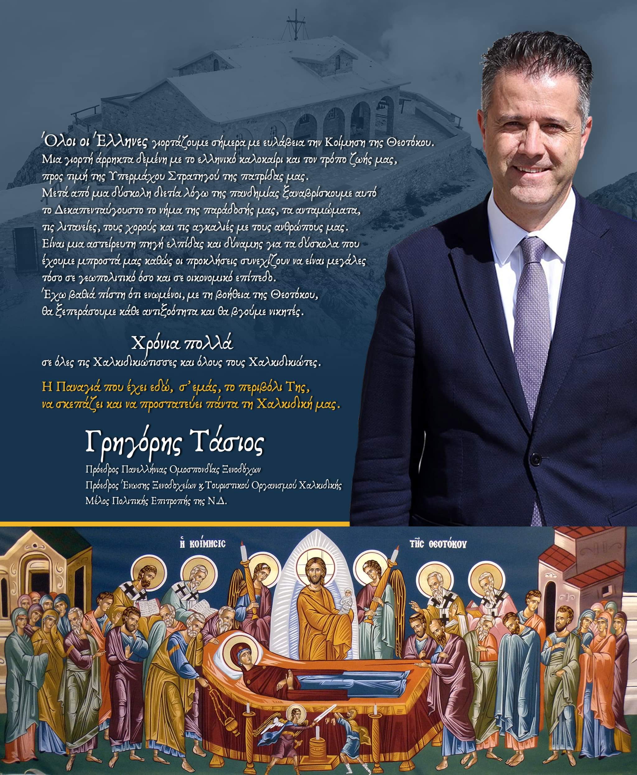 Μετά από μια δύσκολη διετία λόγω της πανδημίας ξαναβρίσκουμε αυτό το Δεκαπενταύγουστο το νήμα της παράδοσής μας, τα ανταμώματα, τις λιτανείες, τους χορούς και τις αγκαλιές με τους ανθρώπους μας. Είναι μια αστείρευτη πηγή ελπίδας και δύναμης για τα δύσκολα που έχουμε μπροστά μας καθώς οι προκλήσεις συνεχίζουν να είναι μεγάλες τόσο σε γεωπολιτικό όσο και σε οικονομικό επίπεδο.