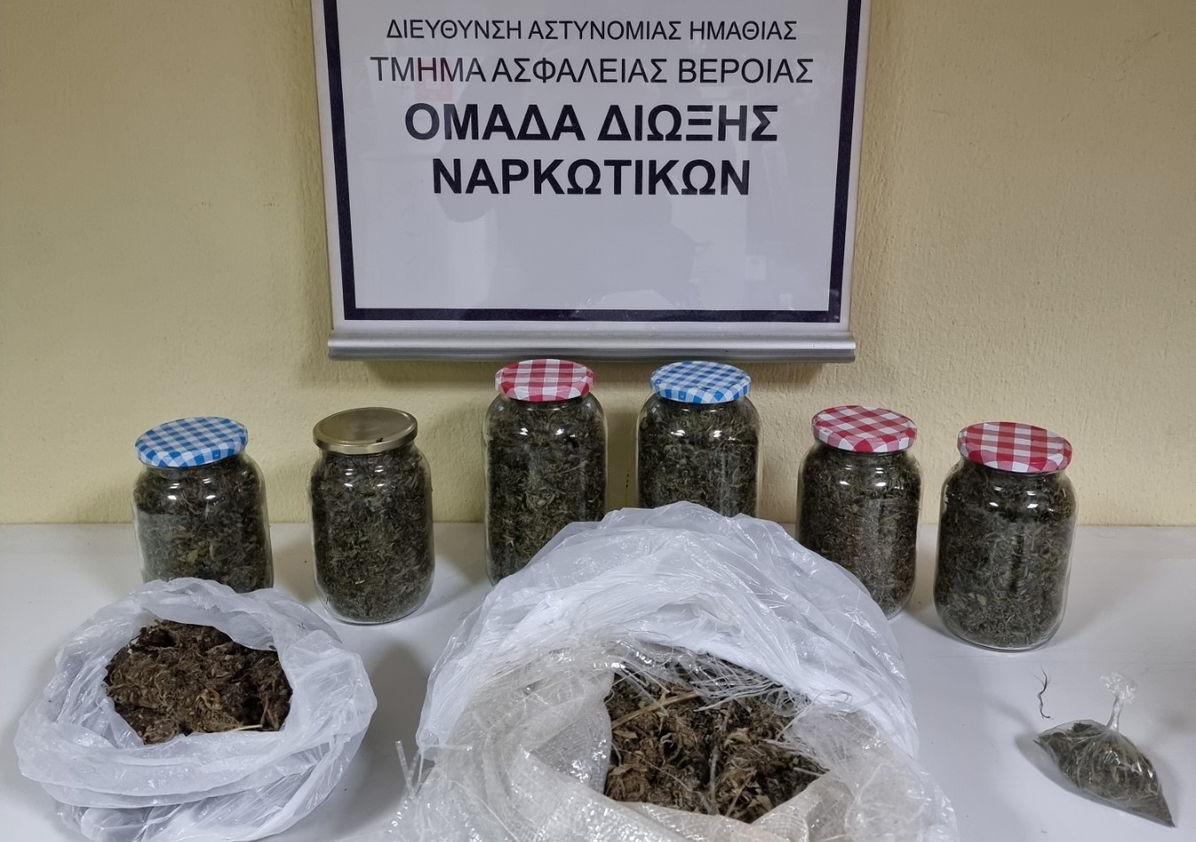- 6 γυάλινα βάζα με κάνναβη συνολικού βάρους 660 γραμμαρίων, που ήταν κρυμμένα κάτω από χόρτα σε περιφραγμένο προαύλιο χώρο της οικίας.