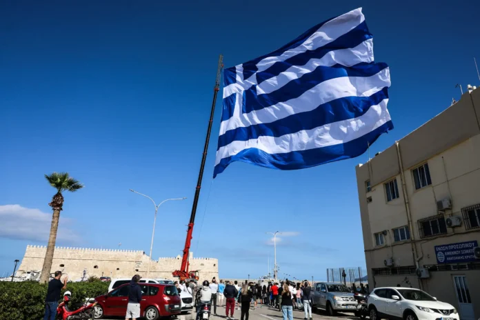 Όπως κάθε χρόνο τα τελευταία χρόνια, έτσι και φέτος στο λιμάνι του Ηρακλείου στην Κρήτη, ανήμερα της 28ης Οκτωβρίου, υψώθηκε η εντυπωσιακή ελληνική σημαία των 1440 τετραγωνικών μέτρων.