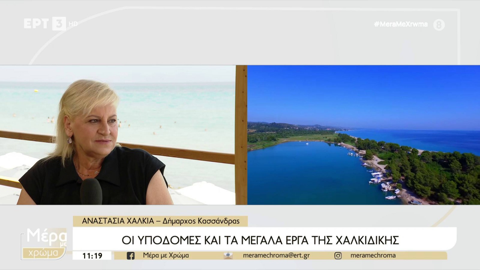 Στην τηλεοπτική εκπομπή ?Μέρα με Χρώμα” της ΕΡΤ3 φιλοξενήθηκε η δήμαρχος Κασσάνδρας Αναστασία Χαλκιά, με αφορμή την πορεία της τουριστικής περιόδου. Η ίδια μίλησε για τα έργα που σχεδιάζονται, τις αναγκαίες υποδομές και τις μελέτες για κατασκευή νέων παρεμβάσεων.