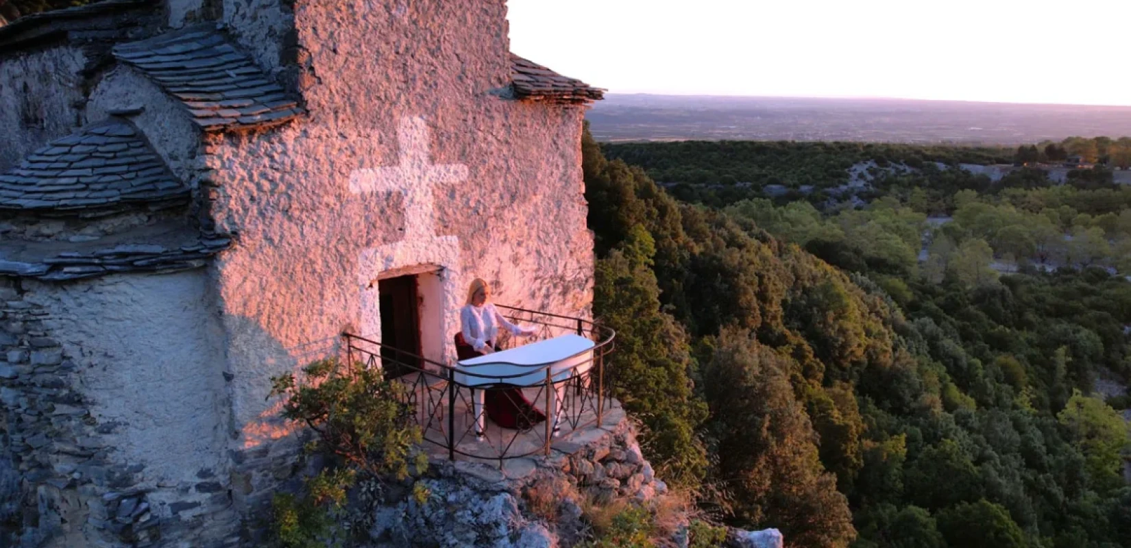 Το τοπίο, μαγικό και σχεδόν μεταφυσικό, κόβει την ανάσα. Το πιάνο ακροβατεί κυριολεκτικά στο χείλος του γκρεμού, ανάμεσα σε ουρανό και γη. Εκεί, η μουσική και η φύση ενώνονται σε μια στιγμή ιερή.