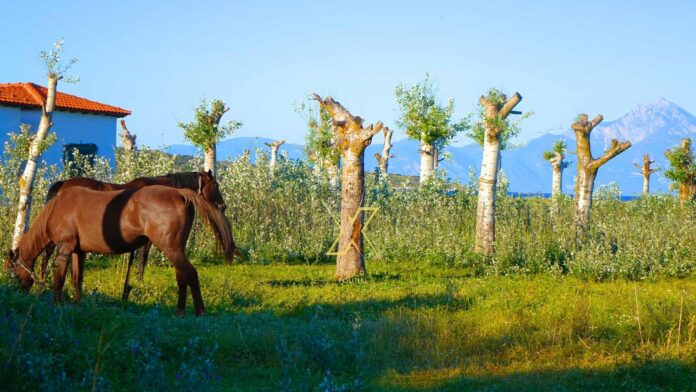 Άλογα στην παραλία της Συκιάς, με τον Άθωνα να ορθώνεται περήφανα στο βάθος.