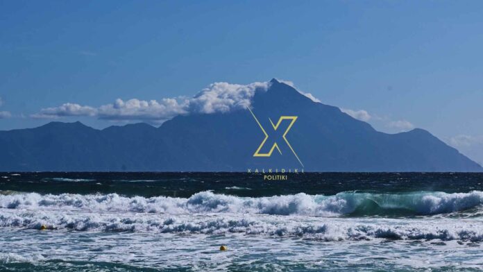 Ο Άθως αγέρωχος, με τα κύματα να σκάνε δυνατά μπροστά του. Η θάλασσα και το βουνό σε μια αέναη μάχη δύναμης, μια εικόνα που συμπυκνώνει την άγρια ομορφιά της Χαλκιδικής.