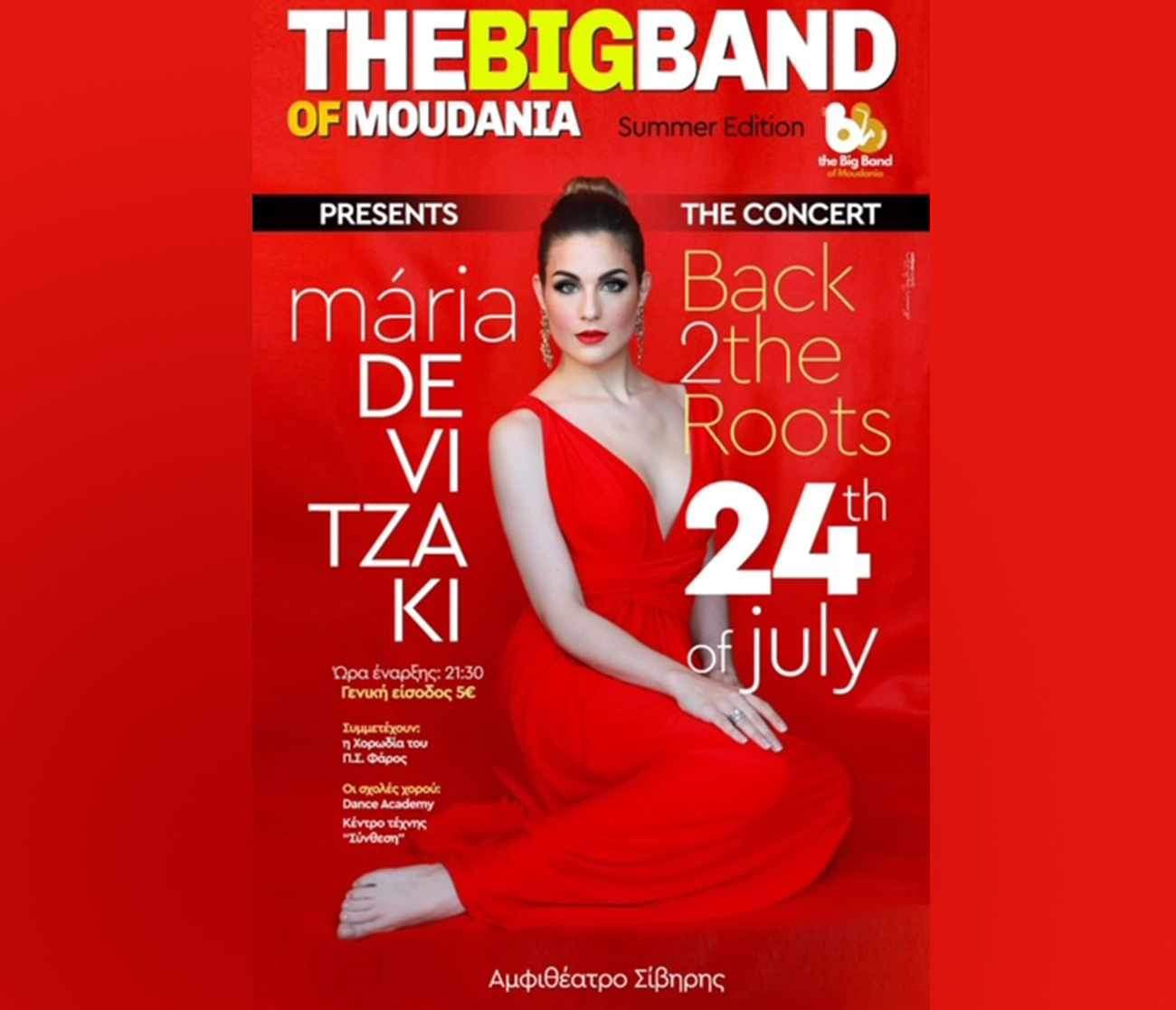Η Μαρία Ντεβιτζάκη συνοδευόμενη από την Big Band of Moudania μαζί με τη χορωδία Πολιτιστικού Συλλόγου Φάρος και χορευτές από Dance Academy Χαλκιδικης και Κέντρο Τέχνης βγαίνουν σήμερα στις 21:30 στη σκηνή του Φεστιβάλ Κασσάνδρας στο αμφιθέατρο Σίβηρης.