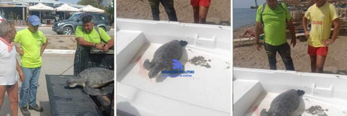 Η χελώνα με την άμεση παρέμβαση του κ. Δήμητσα και με την βοήθεια των εθελοντών απομακρύνθηκε από την παραλία και πήρε τον δρόμο για την ταφή της.