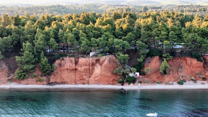 Η παραλία ξεχωρίζει για το ιδιαίτερο τοπίο της. Από τη μία πλευρά, τα πεύκα κατηφορίζουν σχεδόν μέχρι την άμμο, προσφέροντας φυσική σκιά και δροσιά ακόμα και τις πιο ζεστές μέρες του καλοκαιριού. Από την άλλη, οι κόκκινοι βράχοι σχηματίζουν ένα εντυπωσιακό φόντο που δίνει χρώμα και χαρακτήρα στον χώρο.