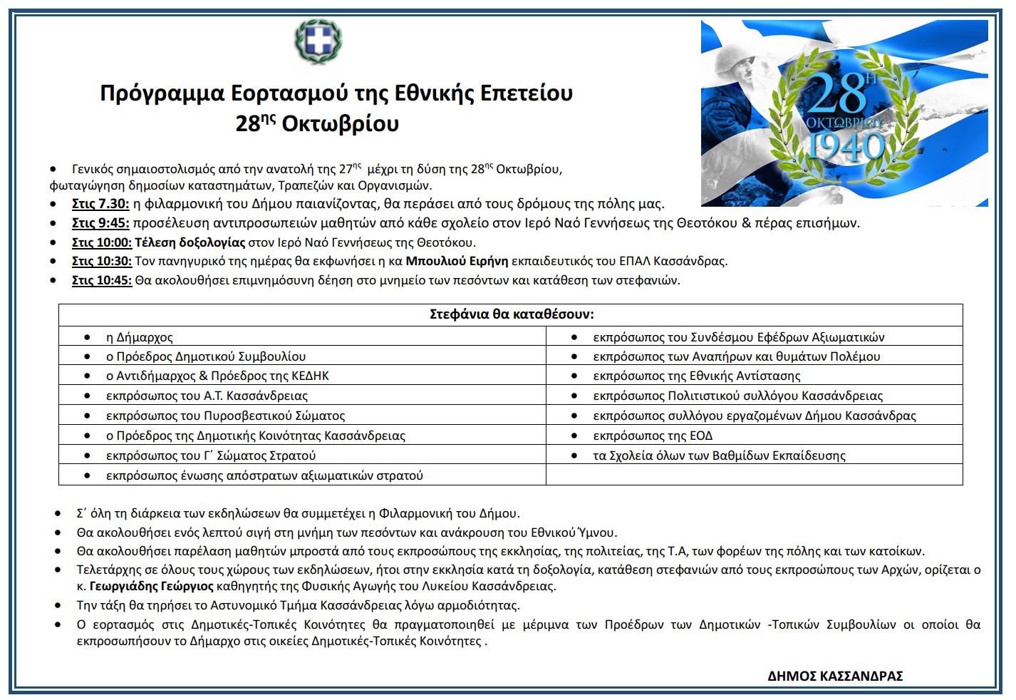 Εκδηλώσεις για τον εορτασμό της Εθνικής Επετείου της 28ης Οκτωβρίου θα πραγματοποιηθούν το Σάββατο 28/10 στον δήμο Κασσάνδρας. Ο εορτασμός της επετείου θα ξεκινήσει από τις 10.00 το πρωί στον Ιερό Ναό Γεννήσεως της Θεοτόκου στην Κασσάνδρεια. Το πρόγραμμα που θα ακολουθήσει έχει ως εξής: