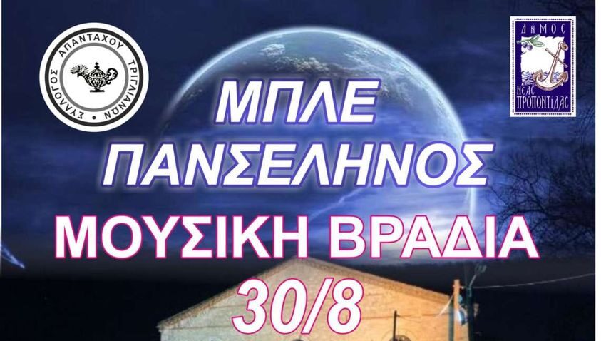 Ο Σύλλογος Απανταχού Τριγλιανών διοργανώνει τη Μουσική βραδιά ”Μπλέ Πανσέληνος”, την Τετάρτη 30/8, στην παραλία Νέας Τρίγλιας ( ώρα 20:30).