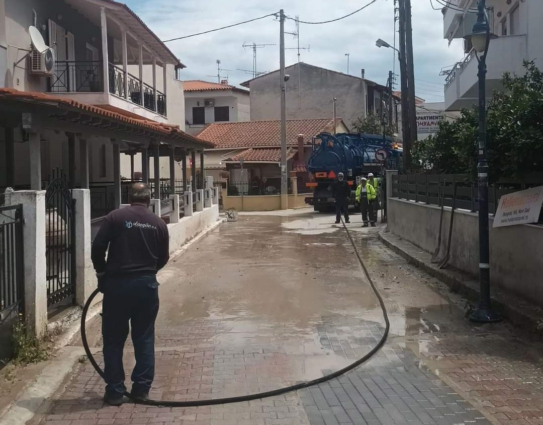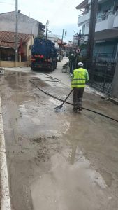 Με πιεστικά, υπάλληλοι του Δήμου καθάρισαν τα πεζοδρόμια, τα πλακόστρωτα και τους δρόμους της περιοχής.