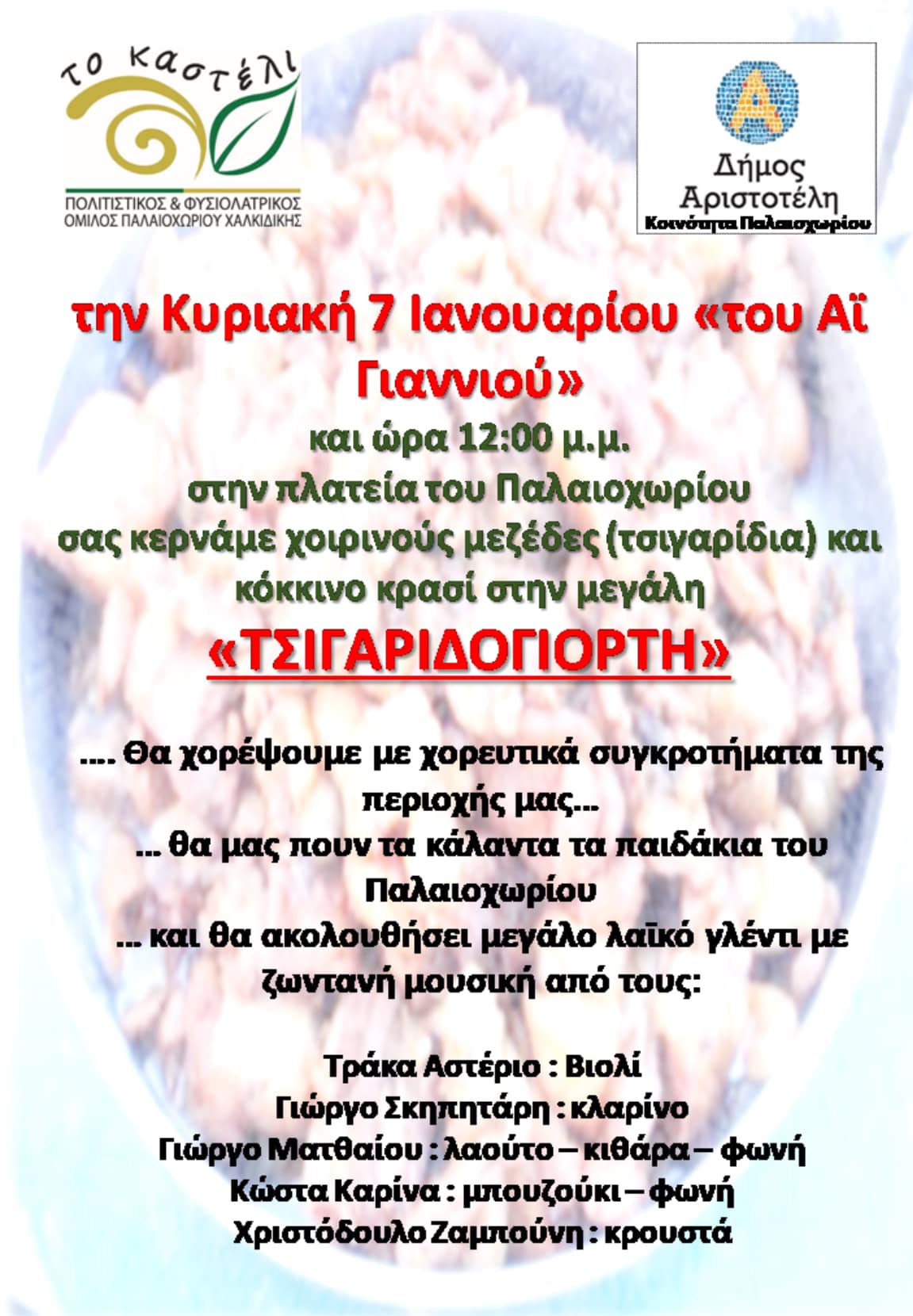 Ο Πολιτιστικός και Φυσιολατρικός Όμιλος Παλαιοχωρίου το Καστέλι διοργανώνει την ξακουστή Τσιγαριδογιορτή την Κυριακή 7 Ιανουαρίου, ημέρα του Αη Γαννιού, στην πλατεία του Παλαιοχωρίου, με πολλούς μεζέδες και άφθονο κρασί.