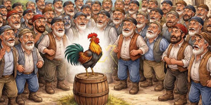 Λέει μάλιστα η παλιά ιστορία πως κάποτε σε ένα χωριό ζούσαν σαράντα πέντε άνθρωποι και όλοι τους λέγονταν Γιάννης. Καλοί άνθρωποι, αλλά όχι και για μεγάλα σχέδια. Όταν ένα ποτάμι φούσκωσε και απείλησε να τους πάρει τα σπίτια, μαζεύτηκαν να βρουν λύση. Συζήτηση πολλή, ιδέες καμία. Κάποιος τότε πρότεινε, μέσα στην απόγνωση, να βάλουν αρχηγό έναν… κόκορα που τριγυρνούσε εκεί κοντά. Τον ακολούθησαν, άρχισαν να χτυπούν το νερό για να το «φοβίσουν» και φυσικά δεν κατάφεραν απολύτως τίποτα. Από εκεί, λέγεται, έμεινε η φράση: πολλοί άνθρωποι, αλλά γνώση… ενός κοκόρου.