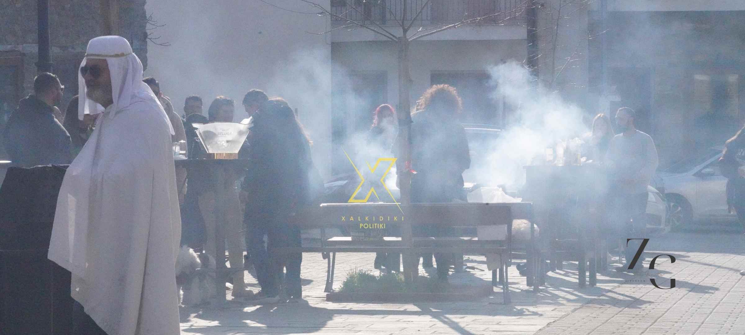 Η έναρξη της Αποκριάς γίνεται στις 13:00 στις γειτονιές του Πολυγύρου, με τους ήχους του ζουρνά και το παραδοσιακό τσίκνισμα. Το κεντρικό γλέντι μπροστά στο Δημαρχείο Πολυγύρου συνοδεύεται από κρασί και ευχές του Δήμου για Καλή Αποκριά.