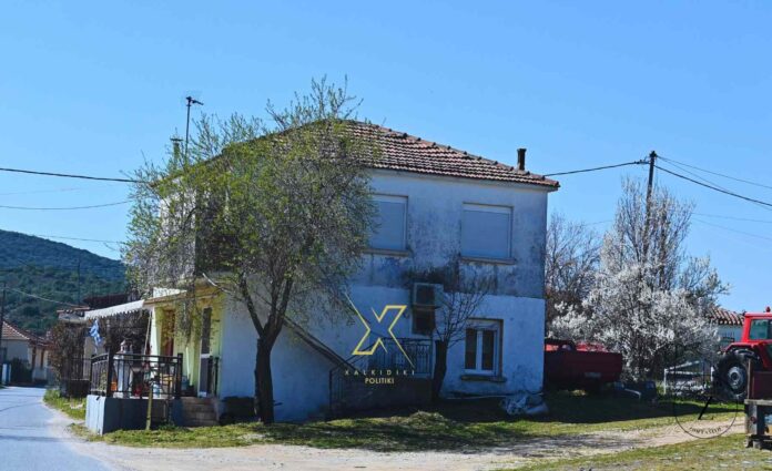 Ένα σπίτι όπως πολλά στα χωριά της ενδοχώρας της Χαλκιδικής. Πίσω το τρακτέρ, μπροστά το μπαλκόνι και η αυλή, ένα δέντρο δίπλα στο σπίτι και η ελληνική σημαία να κυματίζει ήσυχα.
