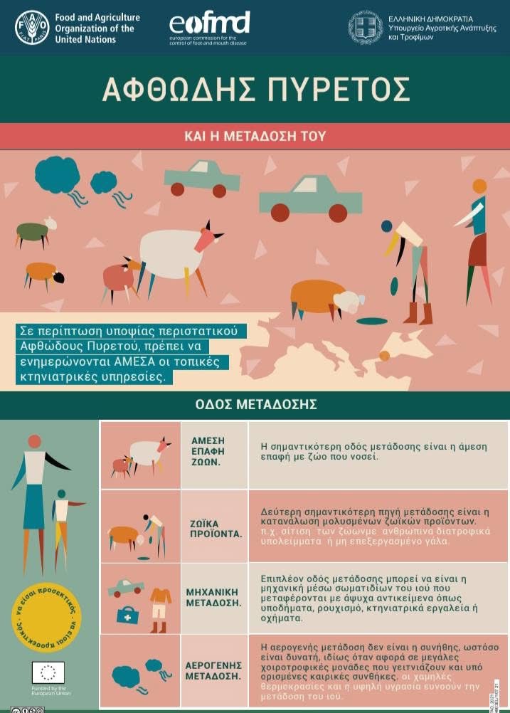 Ο Αφθώδης πυρετός είναι εξαιρετικά μεταδοτικό ιογενές νόσημα που προσβάλλει τα δίχηλα ζώα, (βοοειδή, αιγοπρόβατα, χοίροι, καθώς και ορισμένα άγρια είδη). Χαρακτηρίζεται από υψηλή μεταδοτικότητα και ταχεία εξάπλωση. Μεταδίδεται μέσω της άμεσης επαφής, της έμμεσης επαφής με μολυσμένα αντικείμενα οχήματα, υποδήματα, εξοπλισμό ή μέσω ανθρώπινης δραστηριότητας καθώς και αερογενώς γεγονός που αυξάνει σημαντικά τον κίνδυνο μόλυνσης γειτονικών εκμεταλλεύσεων και της διασποράς της νόσου. Άγρια ζώα και τρωκτικά δύνανται να μεταφέρουν τον ιό από μολυσμένες εκμεταλλεύσεις σε υγιείς.