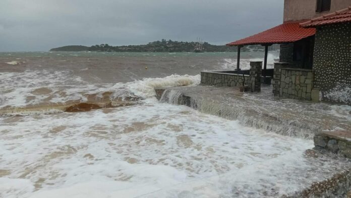 Ισχυρός κυματισμός και θυελλώδεις άνεμοι πλήττουν τον Όρμο Παναγίας, με τη θάλασσα να βγαίνει στον παραλιακό χώρο και τα νερά να κατακλύζουν πεζοδρόμια και καταστήματα. Το κύμα σπάει πάνω στις κατασκευές, μεταφέροντας φερτά υλικά, ενώ η κυκλοφορία στο παραλιακό μέτωπο γίνεται με δυσκολία.