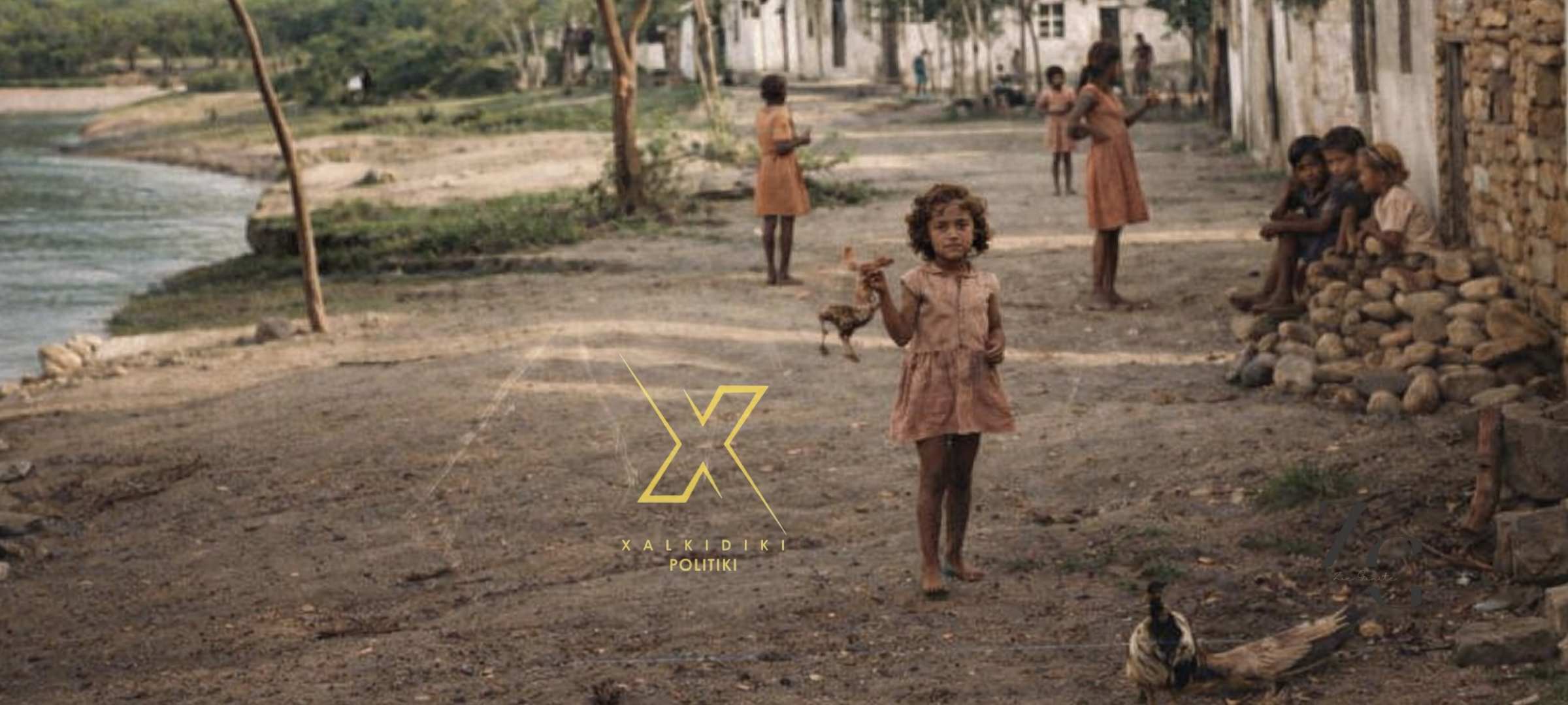 Στο βάθος, παιδιά παίζουν και στέκονται έξω από χαμηλά σπίτια, ενώ η θάλασσα εκτείνεται στα αριστερά του κάδρου. Η εικόνα αποτυπώνει μια καθημερινή στιγμή ζωής