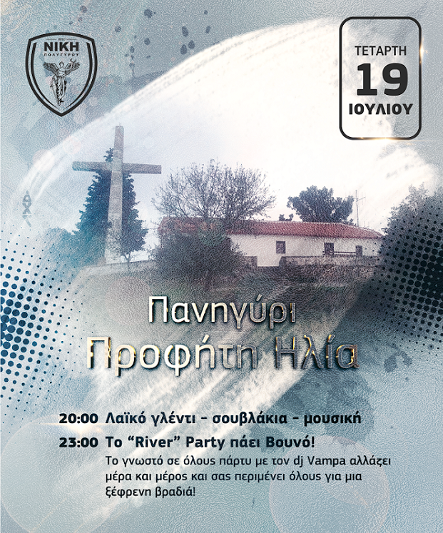 Η Νίκη Πολυγύρου, με την Ελπίδα και την υποστήριξη της Νεολαίας Πολυγύρου, διοργανώνουν και αναβιώνουν όπως τα τελευταία 5 χρόνια το πανηγύρι της Παναγίας και το πανηγύρι του Προφήτη Ηλία πάνω στην κορυφή στο ομορφότερο μέρος του Πολυγύρου.