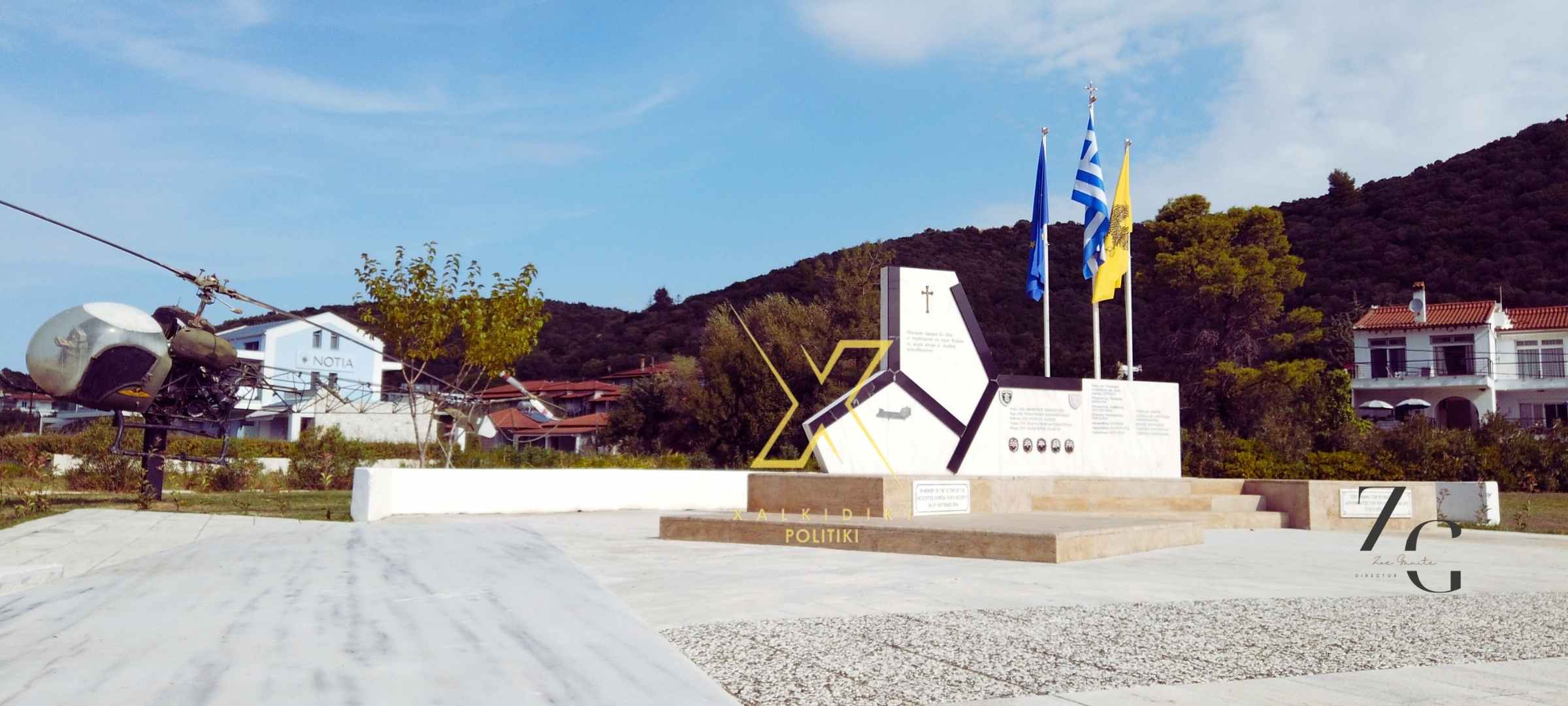 Στην εικόνα διακρίνεται το μνημείο μνήμης στο Πόρτο Κουφό Χαλκιδικής, αφιερωμένο στους πεσόντες από τη συντριβή του στρατιωτικού ελικοπτέρου τύπου Σινούκ.