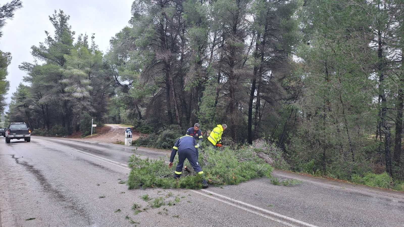 Σε συνεργασία με τα αρμόδια συνεργεία, πραγματοποιήθηκε η απομάκρυνση των πεσμένων δέντρων και η σταδιακή αποκατάσταση της κυκλοφορίας, διασφαλίζοντας την ασφάλεια της περιοχή