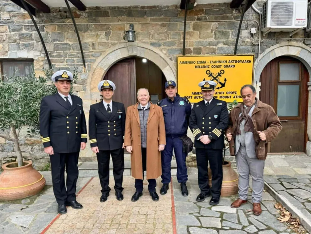 Αρχικά, στο Λιμάνι της Δάφνης, έγινε δεκτός από τον Λιμενάρχη Αγίου Όρους Πλωτάρχη Λ. Σ Σωτήριο Βουγιούκα, επισκέφτηκε το Λιμεναρχείο Αγίου Όρους όπου συνομίλησε με τα στελέχη του Λιμεναρχείου για τα θέματα που απασχολούν την Υπηρεσία.