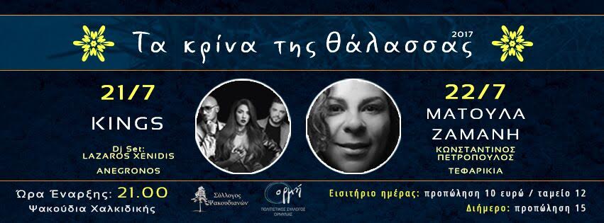 «Τα κρίνα της θάλασσας» το νέο Μουσικό Φεστιβάλ της Χαλκιδικής που διοργανώνεται από φέτος στα Ψακούδια θα γίνει την Παρασκευή 21 και το Σάββατο 22 Ιουλίου.