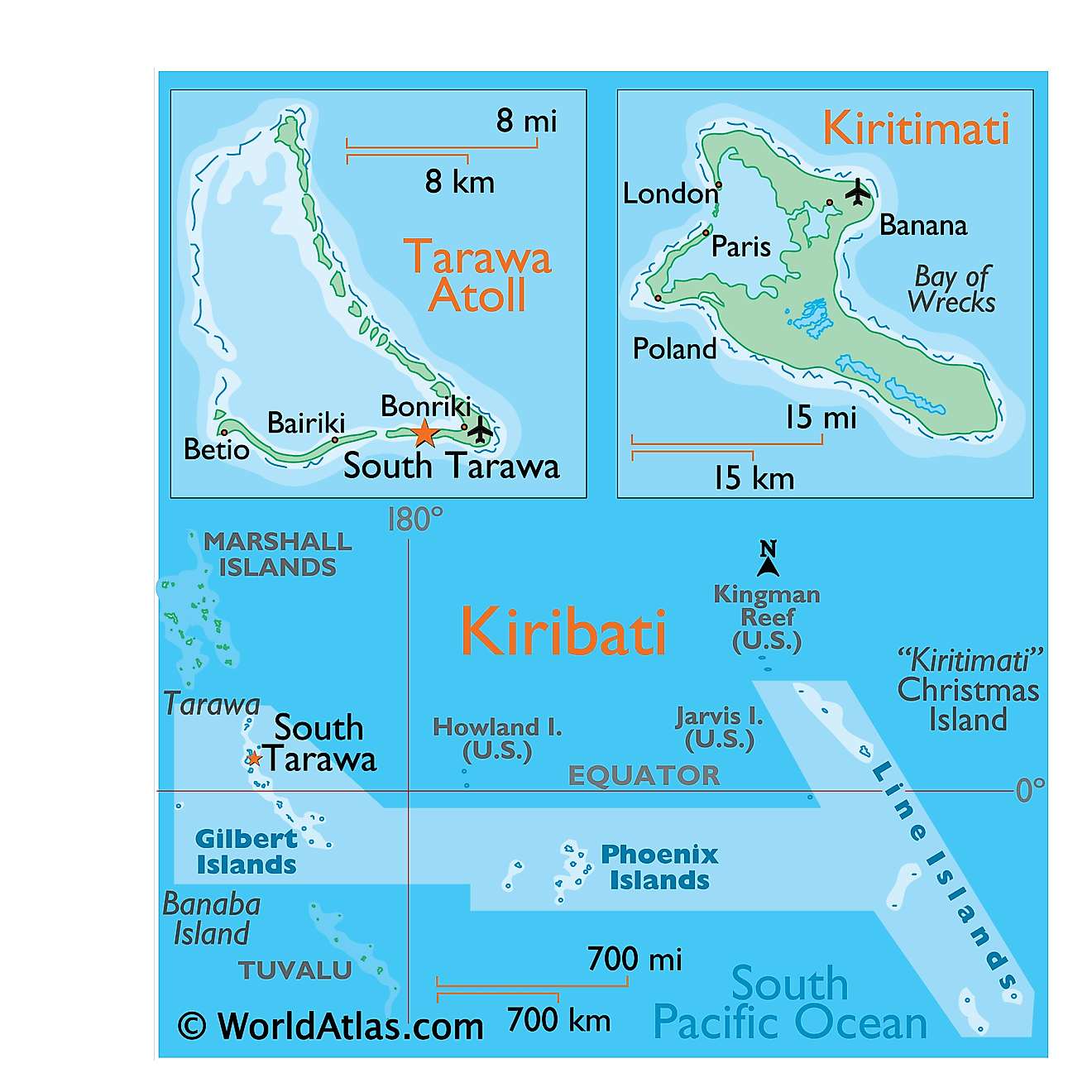 Το Kiribati είναι ένα μικρό νησιωτικό κράτος στον κεντρικό Ειρηνικό Ωκεανό, αποτελούμενο από 33 ατόλες και νησιά, διάσπαρτα σε μια τεράστια θαλάσσια έκταση. Το σημείο-κλειδί όμως που το καθιστά «πρώτο» στον κόσμο είναι το νησί Kiritimati, γνωστό και ως Νήσος των Χριστουγέννων. Το Kiritimati βρίσκεται στη ζώνη ώρας UTC+14, την πιο προχωρημένη χρονική ζώνη του πλανήτη. Έτσι, η αλλαγή του έτους συμβαίνει πρώτα εκεί και ακολουθεί σταδιακά όλος ο υπόλοιπος κόσμος.