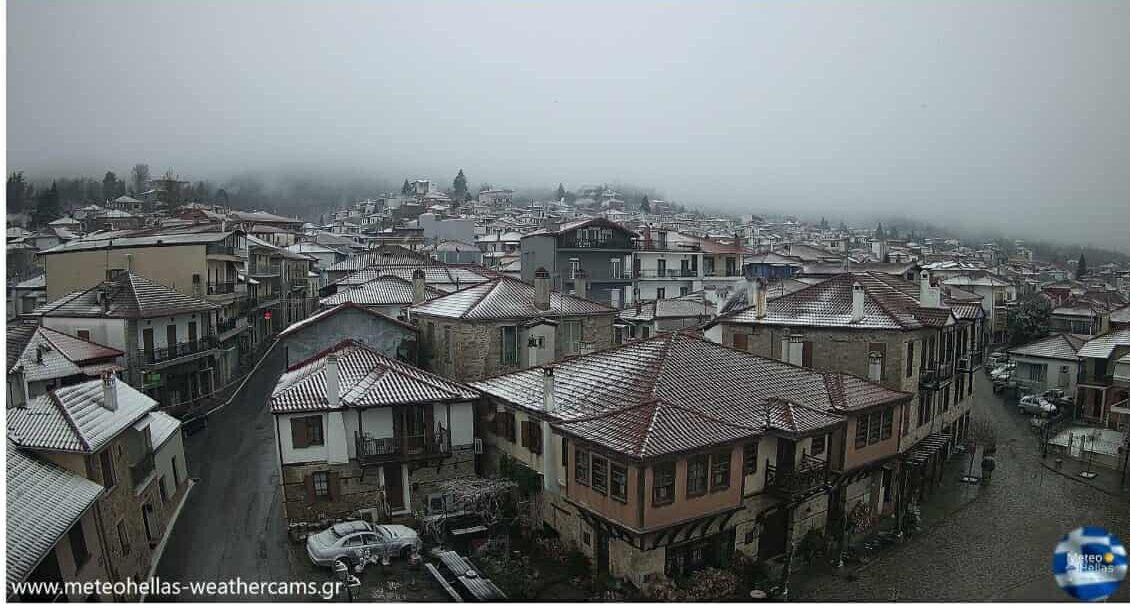 Η εικόνα από τις ζωντανές διαδικτυακές οι κάμερες της περιοχής επιβεβαιώνει ότι το χιόνι καλύπτει στέγες, δρόμους και υπαίθριους χώρους μέσα στον οικισμό.